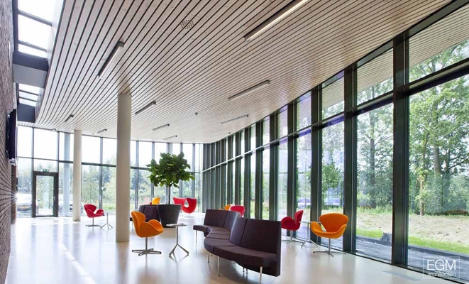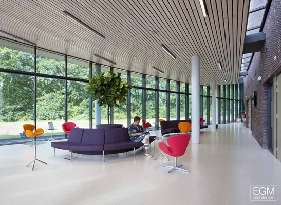 Binnen het gebouw komen deze eigenschappen tot uitdrukking in de inrichting, logistiek en vormgeving, zegt EGM. “Transparantie, natuurlijke lichtinval, kleurstelling en ruimte zijn bepalend in het ontwerp. De openheid van de instelling wordt onder andere weerspiegeld door de open wachtgebieden die met elkaar in verbinding staan. Door hun uitzicht, ligging en verschil in plafondhoogte heeft iedere wachtplek een eigen karakter.”