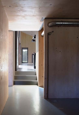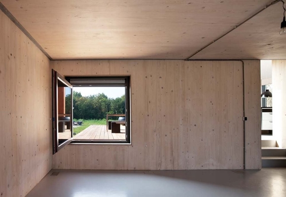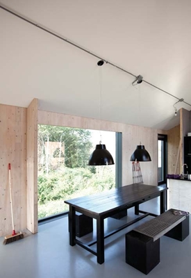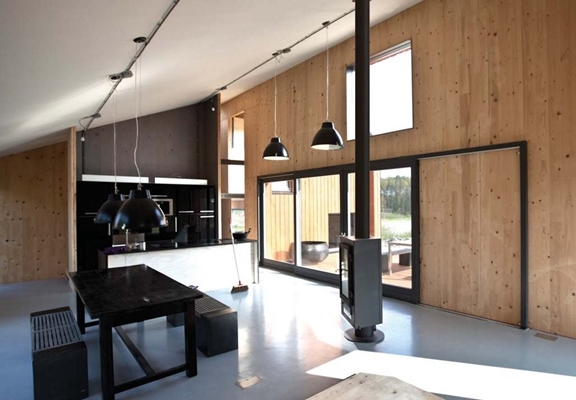 Het interieur van het huis is net als het buitenterras bekleed met houten panelen. De zwarte kleur van het rubber van het exterieur komt terug in het interieur door zwart geschilderde houten panelen, zwarte lampen en zwarte meubels.