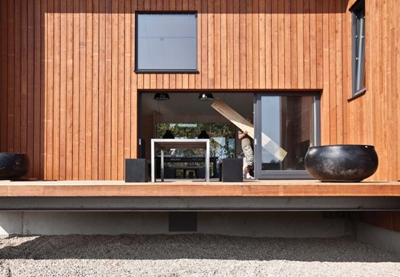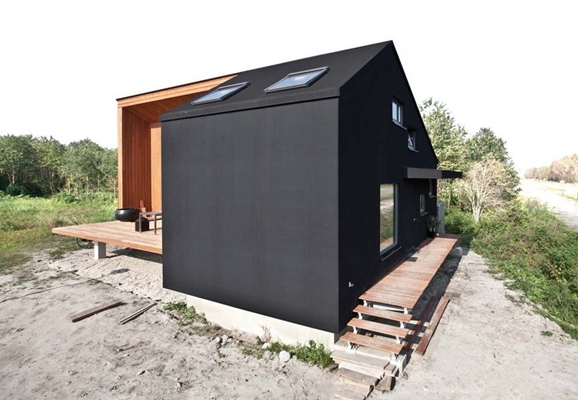 De gevels van de woning zijn bekleed met EPDM-folie (een soort rubber), wat ook vaak gebruikt wordt voor de bekleding van de platte daken van huizengarages. Aan de voorkant van de woning is een inham gemaakt voor een terras. De gevels rond dit terras zijn bekleed met lorkenhout.
