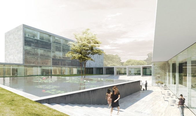 De gebouwen worden rond de fundering van een bestaand gebouw gegroepeerd. Deze fundering wordt getransformeerd tot een waterpartij. Het gebouw ten oosten van de waterpartij is bestemd voor publieke functies, zoals een cafetaria en een auditorium.