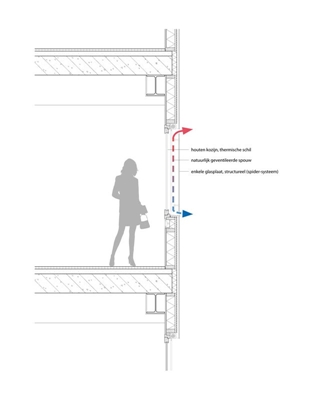 In het ontwerp voor het kantoorgebouw is er gekozen voor houten kozijnen in plaats van veel meer onderhoudsarme aluminium kozijnen. Door een extra structurele glasplaat te ontwerpen voor de houten kozijnen wordt het hout beschermd tegen weer en wind waardoor het veel minder onderhoud behoeft.