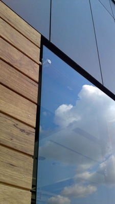 De dichte delen van de gevel bestaan uit Eternit en Platowood rabatdelen. Platowood is thermisch verduurzaamd hout. Het ‘koken’ van het hout koppelt de lage milieulast van hout (met keurmerk) aan een lange levensduur.