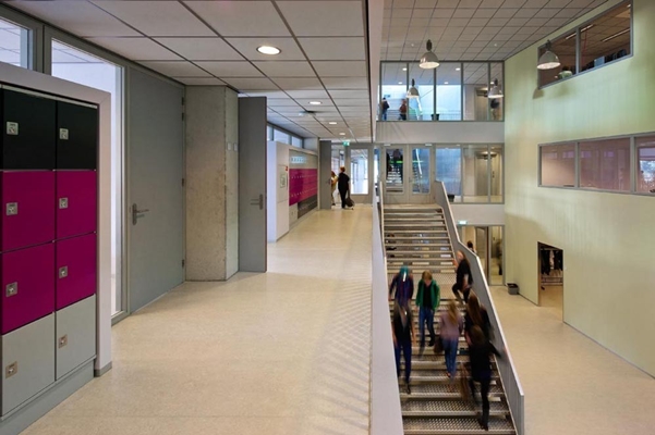 Het onderwijsgedeelte van het pand heeft een centrale aula waar enkele leslokalen aan grenzen. Deze leslokalen liggen aan een hoge galerij rondom de aula. De overige werkruimtes van de school bevinden zich aan de oostzijde in het gebouw. Jeanne Dekkers Architectuur heeft de lesruimtes zo open mogelijk gehouden om tegemoet te komen aan de huidige onderwijsmethode.