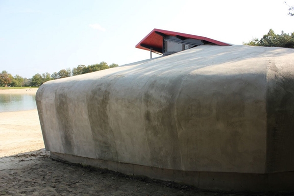 Bij recreatieplas de Galderse Meren in de buurt van Breda is een paviljoen met een schil van zelfherstellend beton opgeleverd. Volgens