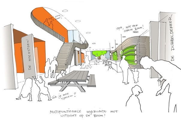 Aan beide koppen van het complex komen twee groene speelpleinen, die nieuwe relaties met de wijk tot stand moeten brengen. “Dit wordt versterkt door de wijkgerichte onderwijs-, opvang-, zorg- en sportfaciliteiten een dubbele ontsluiting te geven: via de centrale ruimte in het hart van het gebouw en via de openbare ruimtes rond het gebouw. Hiermee worden alle façades van het gebouw tevens voorgevel”, aldus De Zwarte Hond.
