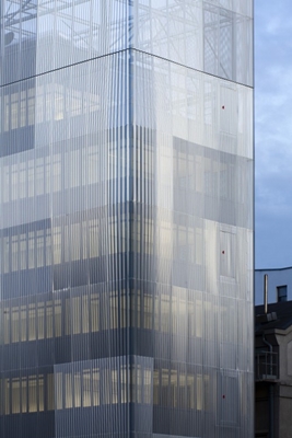 Tegen de gevels van het door Antonini + Damon Architectes ontworpen gebouw zijn witte roosters geplaatst als ‘tweede huid’. De stukken gevel van de eerste huid zijn uitgevoerd in verschillende grijstinten, waardoor er een speels effect in de gevels ontstaat. Het gebouw is een paar meter boven de grond opgetild door acht kolommen, zodat vanaf de straat te zien is hoe het nieuwe gebouw in de open plek naast het oude pand past.
