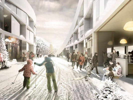 BIG heeft in het ontwerp vier hoofdgebouwen opgenomen, die gegroepeerd zijn rond een centraal plein. Omdat veel bergafdalingen rond het resort te moeilijk te bereiken zijn om te skiën, bedacht het bureau een ‘skidak’ voor een van de hoofdgebouwen. Via vier kronkelende hellingbanen kan de bezoeker vanaf het dak naar beneden skiën.