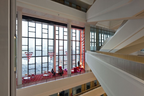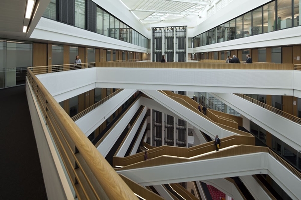 De twee kantoorgebouwen aan het water van de Spiegel Gruppe (uitgeverij) hebben beide een U-vorm met in het midden een verdiepte gevel. In het verdiepte gedeelte bevindt zich een enorm atrium met diverse vides. Het atrium kan op verschillende etages worden overgestoken dankzij witte loopbruggen. Alle kantoor- en loungeruimtes zijn of volledig open of enkel afgeschermd door een glazen binnengevel. Dit zorgt voor een open werkvloer.