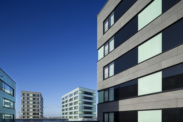 “De torens verschillen heel bewust allemaal van hoogte. Zo wordt het maximale aan zon, uitzicht en toegankelijkheid naar de groene omgeving bereikt,” zegt Anja Blechen, projectarchitect bij Benthem Crouwel. “Door te werken met lichte wandbekleding (wit betoncomposiet) aan de binnenzijde van Crescendo en de slingervorm, creëren we een heldere open omgeving, die tegelijkertijd de intimiteit van een woonhofje kent.” Voor de gevels van de buitenkant van het complex is basalt lavasteen gebruikt. De groene structuurglaspanelen op de bouwdelen weerspiegelen de lichtreflectie van de Maas.