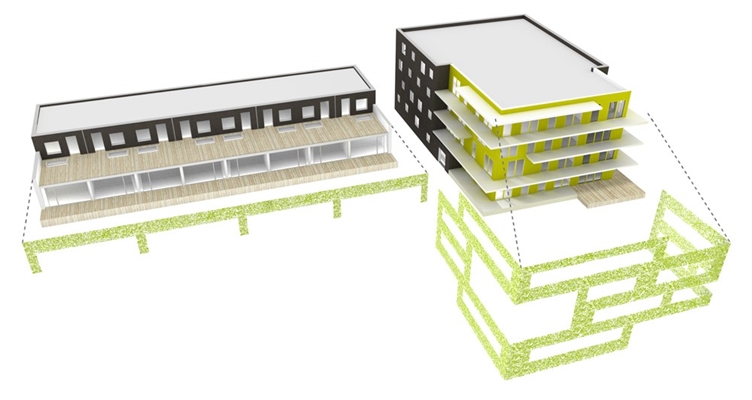 Woongebouw voor gezinnen biedt ruime corridor en gekoppelde terrassen met glijbaan