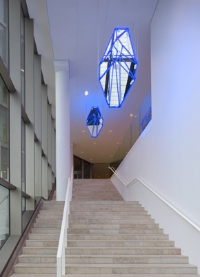 is gebaseerd op een klaverblad, geleed in drie atria. In twee ervan staat een sculpturale installatie met vergaderruimtes opgesteld.
