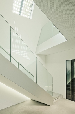 Via betonnen trappen met glazen balustrades bereikt de bezoeker vanuit de uitbreiding de ruimtes op de etages van de toren en het voormalige woonhuis. “De uitbreiding zorgt ervoor dat het gevoel van historische waarde voor het oude woonhuis en de toren wordt versterkt. De bezoeker doet een stap terug in de tijd wanneer hij vanuit de uitbreiding de oudbouw in loopt”, legt :mlzd uit.