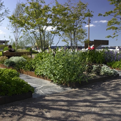 De bureaus ontwierpen een één kilometer lange promenade met trappen naar het water en verschillende terrassen. Ook zijn er stadstuinen aangelegd waar bezoekers kunnen ontspannen, sporten of een markt kunnen bezoeken. De tuinen liggen zestig centimeter verdiept ter bescherming van de wind vanaf Limfjorden en worden van elkaar gescheiden door houten ‘velden’.