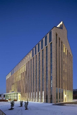 Waar het kantoor vanaf de snelweg oogt als een monoliet met herkenbare dakvorm, ontvouwen zich van dichtbij de sculpturale details. “Bij het passeren van de langsgevel overheerst de verticale ritmiek van het baksteen. Frontaal wordt de schijnbare onneembare vesting een transparant en uitnodigend gebouw”, zegt De Zwarte Hond.
