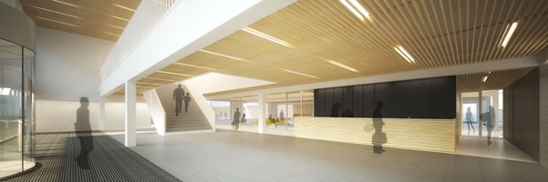“De binnenmaterialisatie ondersteunt het gebouwconcept: de houtaccenten in draagconstructies, daken, vloeren, wanden en puien vormen een sterk beeldbepalend en warm element”, vervolgt het architectenbureau.