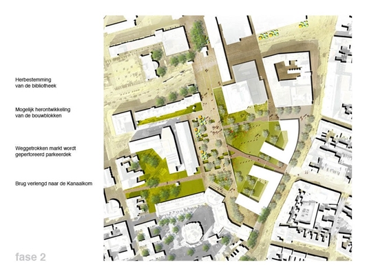 “Het voorstel voor deze verleidingsmanoeuvre is om in fases zorgvuldig te slopen in het dak van de parkeergarage. In de eerste fase verandert de zuidoostzijde van het plein in een verdiepte, glooiende tuin. Aan de noordzijde krijgt het parkeerdek perforaties, waardoor bomen de kans krijgen in de volle grond te groeien en door het dek heen naar boven te prikken. De weekmarkt wordt geïntensiveerd in een marktroute, aan de westzijde van het plein.”