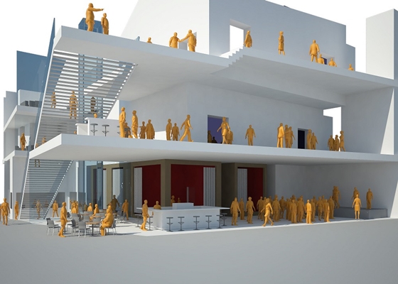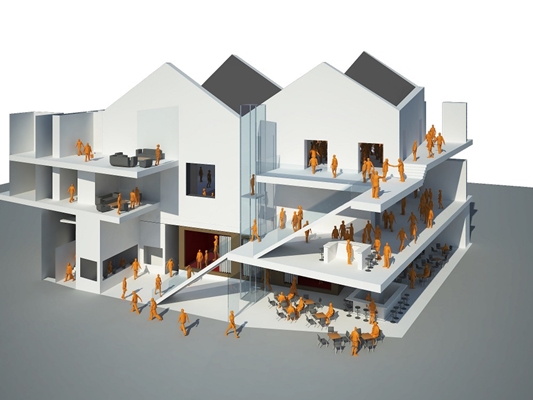 “We positioneren het programma zo, dat een open, transparante sfeer op de begane grond ontstaat, met uitnodigende plint, die voor aansluiting met het stedelijke weefsel zorgt.” De activiteiten binnen in het gebouw zijn door de voorbijganger vanaf de straat te zien door de grote vensters op elke etage.