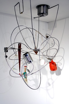 Daarbij tikt het hamertje verschillende objecten aan die aan de draad zijn gehangen: een glazen fles, een verroest zaagje, een blikje, een lepel, en dergelijke. Aan het einde zorgt het gewicht van het hamertje dat de hele constructie overhelt en het hamertje terugvalt in zijn uitgangspositie. Elke Cacophony Bell zou door de bezitter van eigen gevonden voorwerpen kunnen worden voorzien.