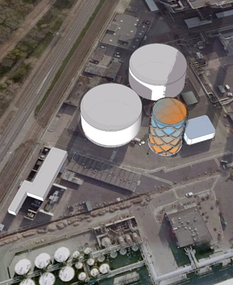 Fillié Verhoeven Architecten maakte een ontwerp van een ronde tank die wordt opgebouwd uit elementen van aluminium. De onderdelen van de gelaagde gevel kunnen na demontage weer gemakkelijk worden hergebruikt. Het ontwerp is ontstaan vanuit het idee om de tank te voorzien van een onderhouds- en inspectietrap. “De combinatie van steektrappen en bordessen leidde tot een patroon dat zich in een netwerk voortzet tot een industrieel geheel”, legt het architectenbureau uit.