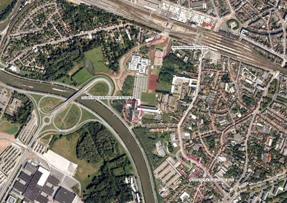 Over het terrein worden nieuwe routes gevormd dankzij wegen die ook gemaakt zijn van houten vlonders. Gebouw B met het cafetaria wordt getransformeerd en gericht op het campusplein met het Oog. Op het plein worden verschillende bomen en struiken gepland om de campus een groene uitstraling te geven.