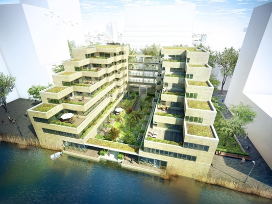Dankzij de getrapte opzet van de bouwdelen hebben enkele appartementen een groot balkon met uitzicht op de binnentuin. De woningen worden gerealiseerd als studio, stadswoningen en penthouses.