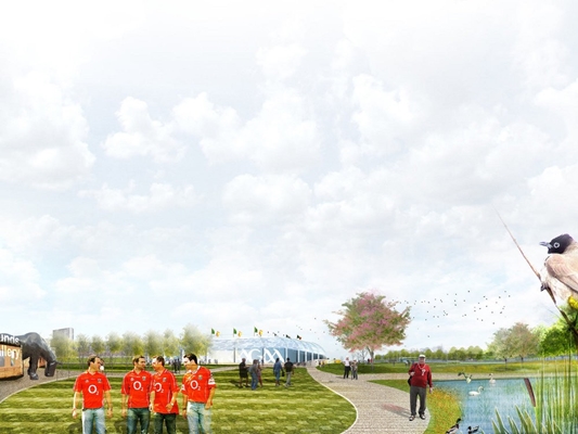. Het bouwwerk is door middel van het padensysteem en wat betreft dubbel ruimtegebruik integraal opgenomen in het parkontwerp. Rondom het stadion komen ruimten voor culturele evenementen en festivals.