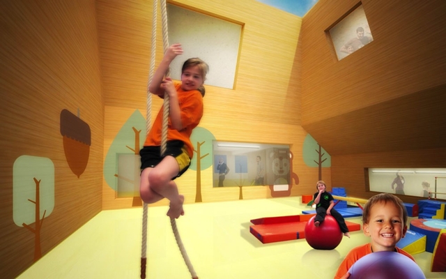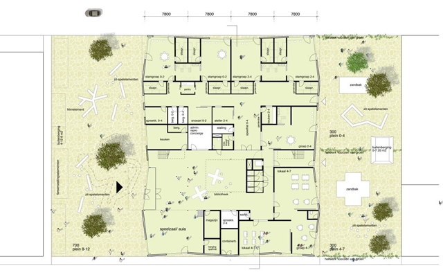 In het centrum zijn de lokalen gesitueerd aan de buitenrand, met in het hart van het gebouw de speelzalen, de aula en de bibliotheek. “Door een minimale constructie te gebruiken is het mogelijk om tussen de stamgroepen (lokalen) meerdere indelingen te realiseren en combinaties te maken”, legt het bureau de flexibiliteit van het gebouw uit. De materialisering is om deze reden licht gehouden.