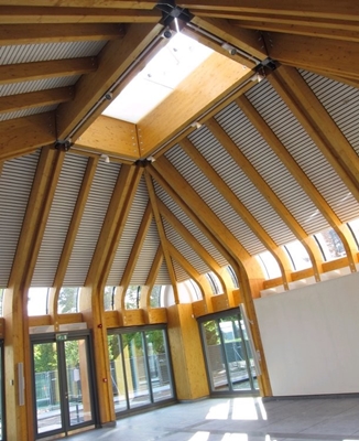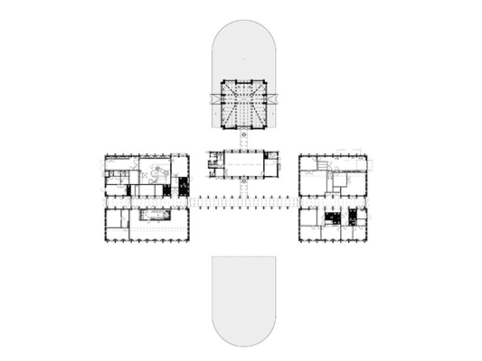 De paviljoens worden gekenmerkt door de gebogen dakkappen. De centrale as met colonnades en een glazen dak verbindt de bestaande ontvangstruimte en aula met de nieuwbouw.