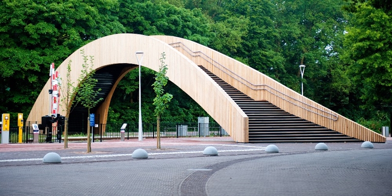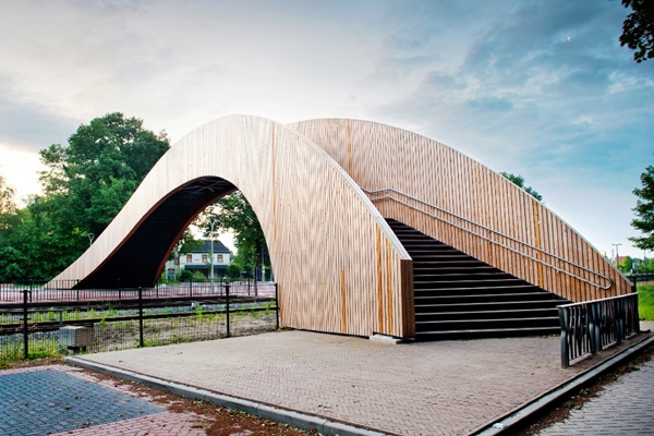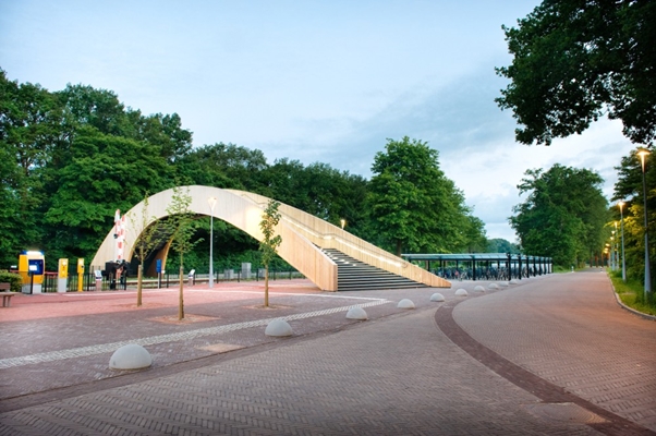 De nieuwe entree is een plein waaraan alle bestaande functies opnieuw zijn geordend. Een houten brug over het spoor zorgt ervoor dat beide zijden van het station met elkaar verbonden worden voor voetgangers. De brug met een brede trap vormt een hoge boog over het spoor. De balustrades zijn volledig gemaakt van houten panelen.
