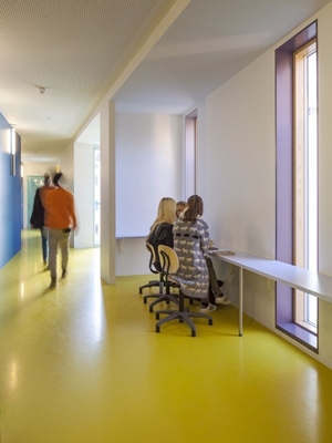 “Het idee was om een gebouw te ontwerpen dat de taal van kinderen spreekt – kleurrijk en muzikaal”, zegt projectarchitect Lone Wiggers. Het kleurschema van de gevel wordt naar binnen doorgezet en op speelse wijze vermengd met hellende muren en meanderende gangen. Dit moet zorgen voor een dynamische leeromgeving.