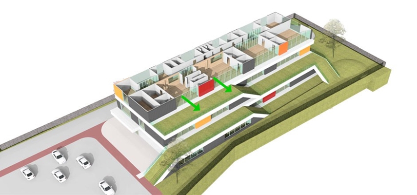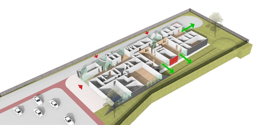 “De verticale, functionele verdeling van het gebouw zorgt voor korte looplijnen en optimaal contact tussen kind en begeleider. Kleur, iconografie en transparantie dragen verder bij aan herkenbaarheid voor het kind”, vertelt Van den Pauwert Architecten.