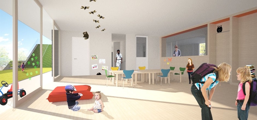 Het bureau kreeg de opdracht om op een beperkt oppervlak de ruimtes voor het centrum te realiseren. Dit leverde het ontwerp van een gebouw met drie etages op, die elk bestemd zijn voor een specifieke groep kinderen.