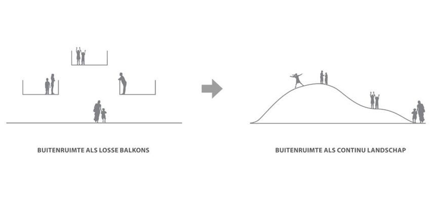 Het pand aan de Ringbaan West heeft als buitenruimte aan de voorzijde een ‘continu maaiveld’; het maaiveld loopt door op de etages via hellingbanen. Deze hellingbanen scheiden de buitenruimtes van de verschillende groepen.