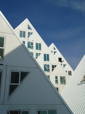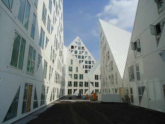 Het woningbouwproject Isbjerget in de Deense stad Aarhus is bouwkundig opgeleverd. In een ensemble van driehoekige en ‘puntige’ gebouwen komen woningen in allerlei soorten en maten. Onder meer het Nederlandse