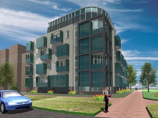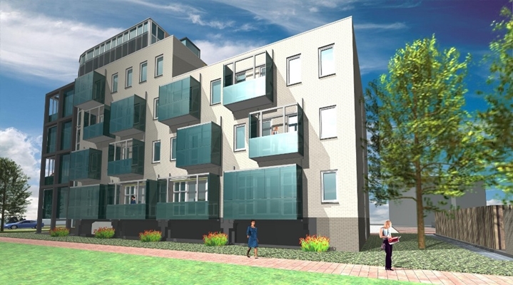 De bovenste, terugliggende verdiepingen worden voorzien van glazen balustrades. Dit moet ook voor de daar gelegen woningen de omgevingsgeluiden dempen.