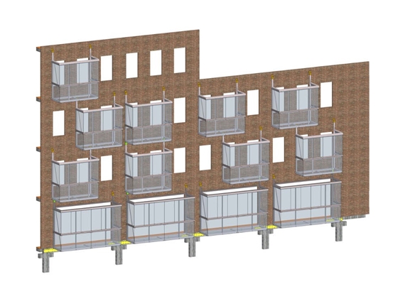 . De onderneming uit Tiel construeert de volglazen balkons in eigen fabriek, waarna ze als geheel aan de gevel van Geinzicht kunnen worden bevestigd.