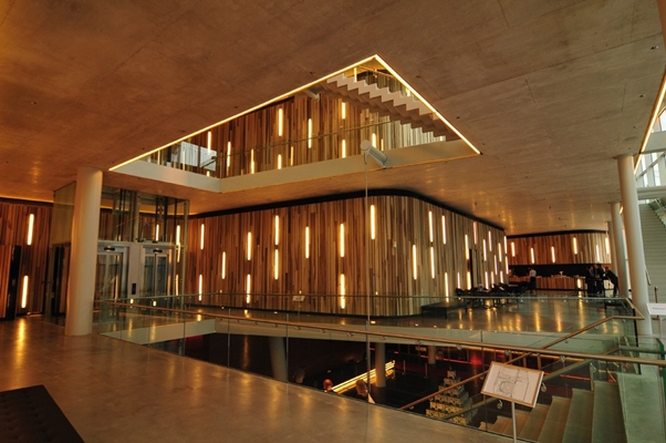 ) een rondleiding door het nieuwe theater. In het interieur van het deze maand opgeleverde theater is veel hout gebruikt.