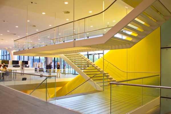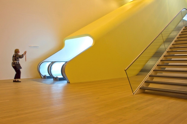 Om de grote zaal onder de entree onlosmakelijk onderdeel te laten zijn van de route door het museum, heeft Crouwel deze direct met lange roltrappen vanaf de eerste verdieping ontsloten. Hoewel de bezoekers met de roltrappen feitelijk door de entreehal bewegen, voorkomt een gele buis rondom de roltrappen een uitwisseling tussen beide sferen. De levendigheid van de entree blijft zo slim gescheiden van de rust van het museum.