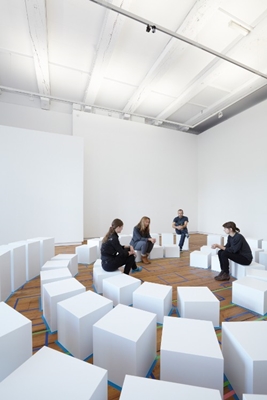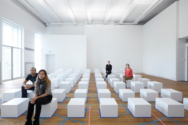 Er zijn vierenzestig witte blokken, alle met een footprint van veertig vierkante centimeter. Ze hebben vijf verschillende hoogtes, tussen de dertig en zeventig centimeter. De verschillende configuraties die op de vloer zijn aangegeven, zijn geschikt voor een specifieke vorm van idee-uitwisseling, aldus XML.