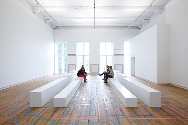 gevraagd een installatie te ontwerpen voor een programma rond het thema kunst en politiek. De installatie bestaat uit witte blokken die kunnen worden geplaatst in configuraties volgens kleurlijnen op de vloer.