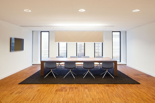 Fokkema & Partners heeft de vertrouwelijkheid van het juridisch werk benadrukt door de vergaderruimten te scheiden van de dagelijkse werkzone. De plattegrond heeft een heldere tweedeling: aan de ene zijde is een open zone met het secretariaat, aan de andere kant ligt de gesloten zone met de kantoorcellen.
