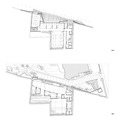 De groene gevel is aan de onderzijde opgetild, waardoor een entreehal op de begane grond zichtbaar wordt. Andersom hebben bezoekers ruim zicht op de tuinen en is de hal ruim voorzien van daglicht.