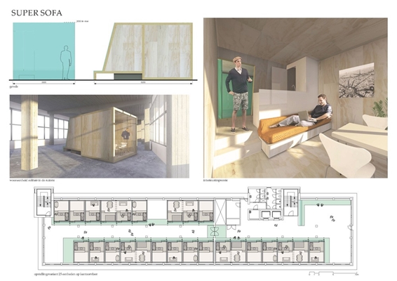 Opgave was om een ontwerp te maken voor een serie eenvoudige woonunits in een overbodig geworden kantoorgebouw. Daarnaast moesten ze bruikbaar zijn voor een lege fabriekshal. SUPER SOFA bestaat uit units die bewoond kunnen worden door studenten, maar tevens geschikt zijn als kamers voor een lowbudgethotel.