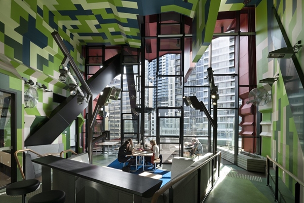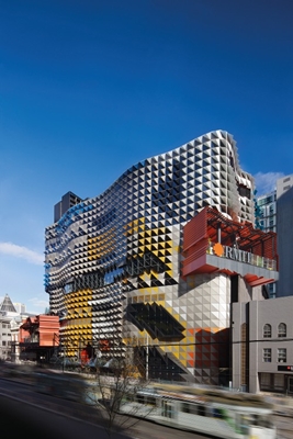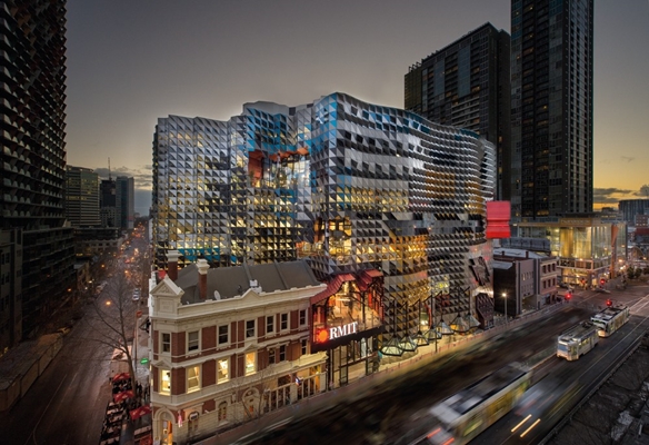 het nieuwe academiegebouw van de RMIT University in Melbourne. Het spectaculaire bouwwerk is opgezet als een verticale campus.