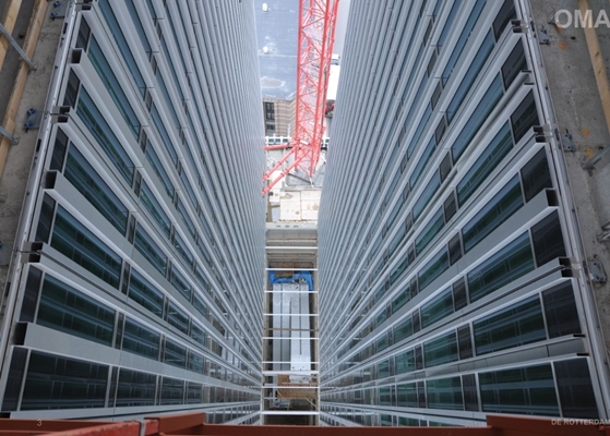 Precies een jaar voor de geplande oplevering van De Rotterdam wordt vandaag, 15 november, het hoogste punt bereikt. Honderdvijftig meter is OMA's nieuwe reus van Rotterdam.