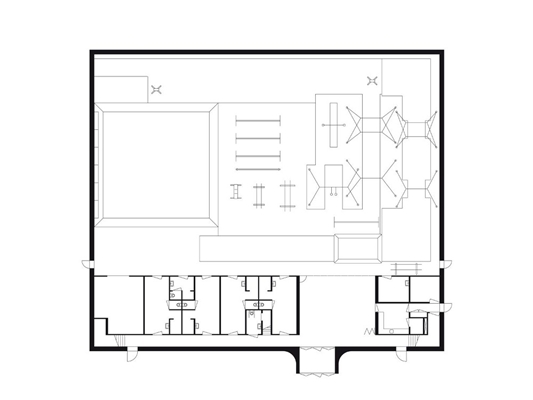 Aan een zijde van de turnhal is een volume geplaatst dat plaats biedt aan kleedkamers, opslagruimtes, technische installaties. Het blok van twee verdiepingen is vrijgehouden van de gevel, zodat langs de muur een hoge, met daglicht gevulde gang loopt. De gang geeft toegang tot de kleedkamers. Trappen aan beide uiteinden van de gang leiden naar de tribune die op de kleedkamers is gesitueerd. Het tochtportaal buigt naar buiten, waarmee de ingang duidelijk herkenbaar is.