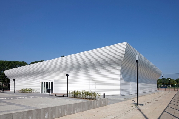 Om de vaak wat sombere sfeer van turnhallen te vermijden, heeft NL Architects de huid van het gebouw aan de bovenzijde iets ‘afgepeld’. Door de lichte buiging ontstaat een opening tussen de dakranden en de muren.