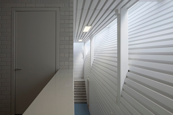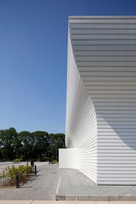 Hierdoor valt licht binnen dat de hal in wordt gekaatst. Doordat de gevel een gelijkmatige buiging vertoont, zorgt het binnenvallende licht voor een verloop over de muur, met een helder oplichten in de richting van de bovenzijde. Aan de buitenzijde wordt het gebouw door de golving sculpturaal.