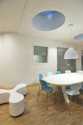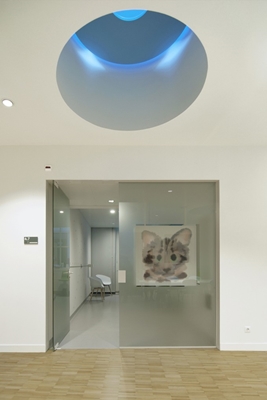 “Het Kinderoogcentrum heeft ronde vriendelijke vormen en kolommen zijn zo veel mogelijk weggewerkt. Door de wachtruimte aan de gevel te situeren en de oorspronkelijke daklichten te openen wordt natuurlijk licht naar binnen gebracht en wordt het gevoel van ruimtelijkheid en oriëntatie vergroot.”