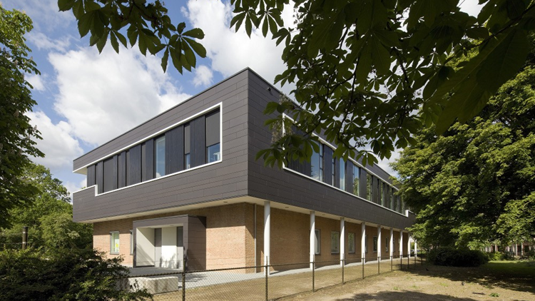 “De gevel voorziet in een passief gebruik van zonnewarmte. De raamopeningen zijn voorzien van verdiepte negges en een uitkragende luifel die ervoor zorgen dat het daglicht altijd binnen kan treden maar directe zoninstraling in de zomer juist geweerd wordt. Bij lage zonnestand in de winter wordt de warmte wel toegelaten”, vertelt het bureau.